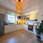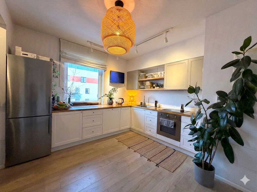 - Kuchnia: Jasna zabudowa, ocieplona drewnianym blatem. Wygląda świetnie, a przy tym jest bardzo funkcjonalna oraz wyposażona w pełny sprzęt AGD.
