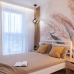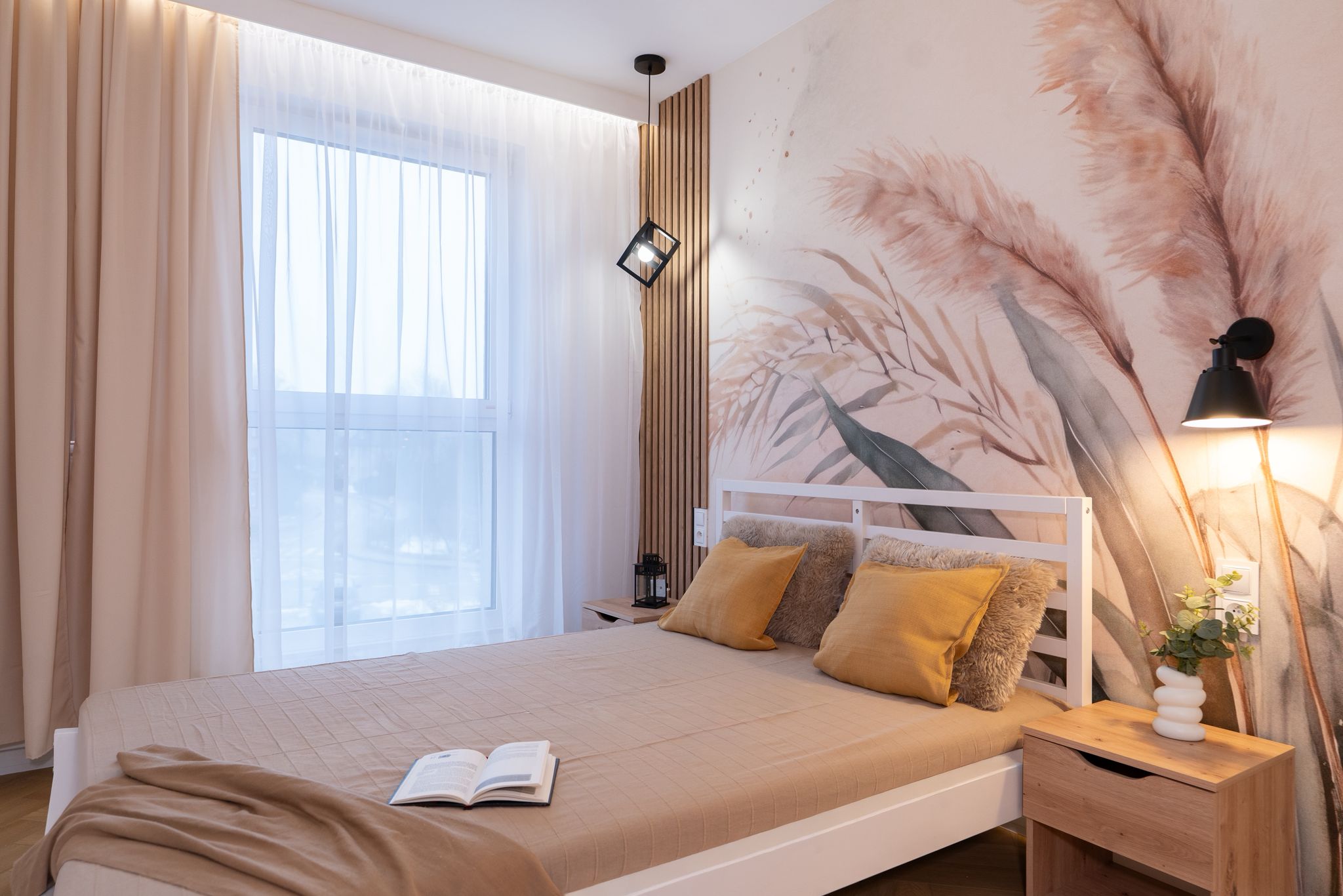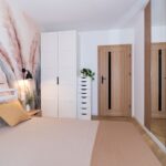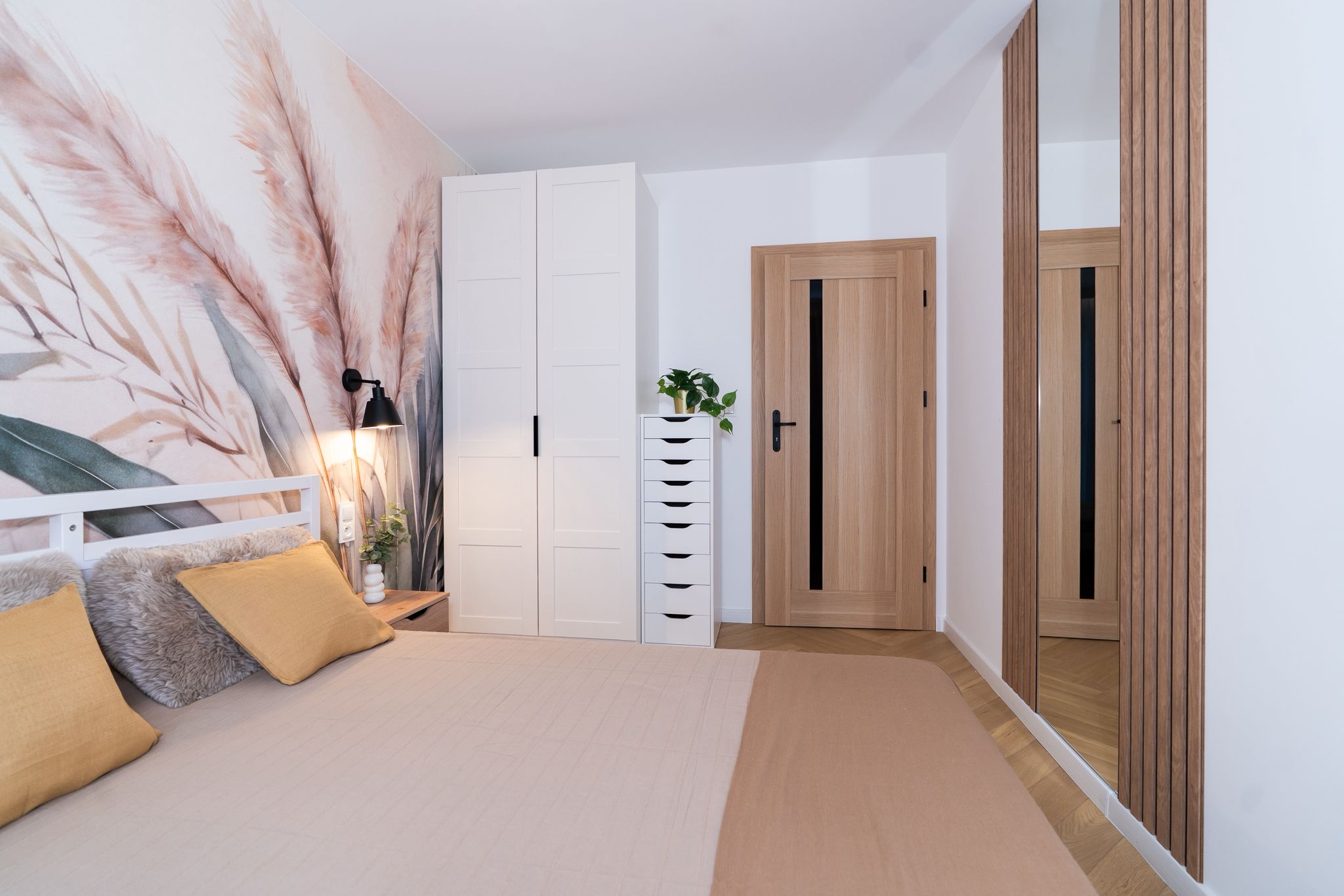 - Sypialnia: Przytulna przestrzeń z dużym łóżkiem, efektowną fototapetą i szafą w zabudowie.