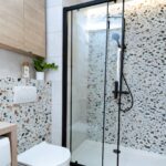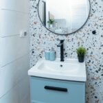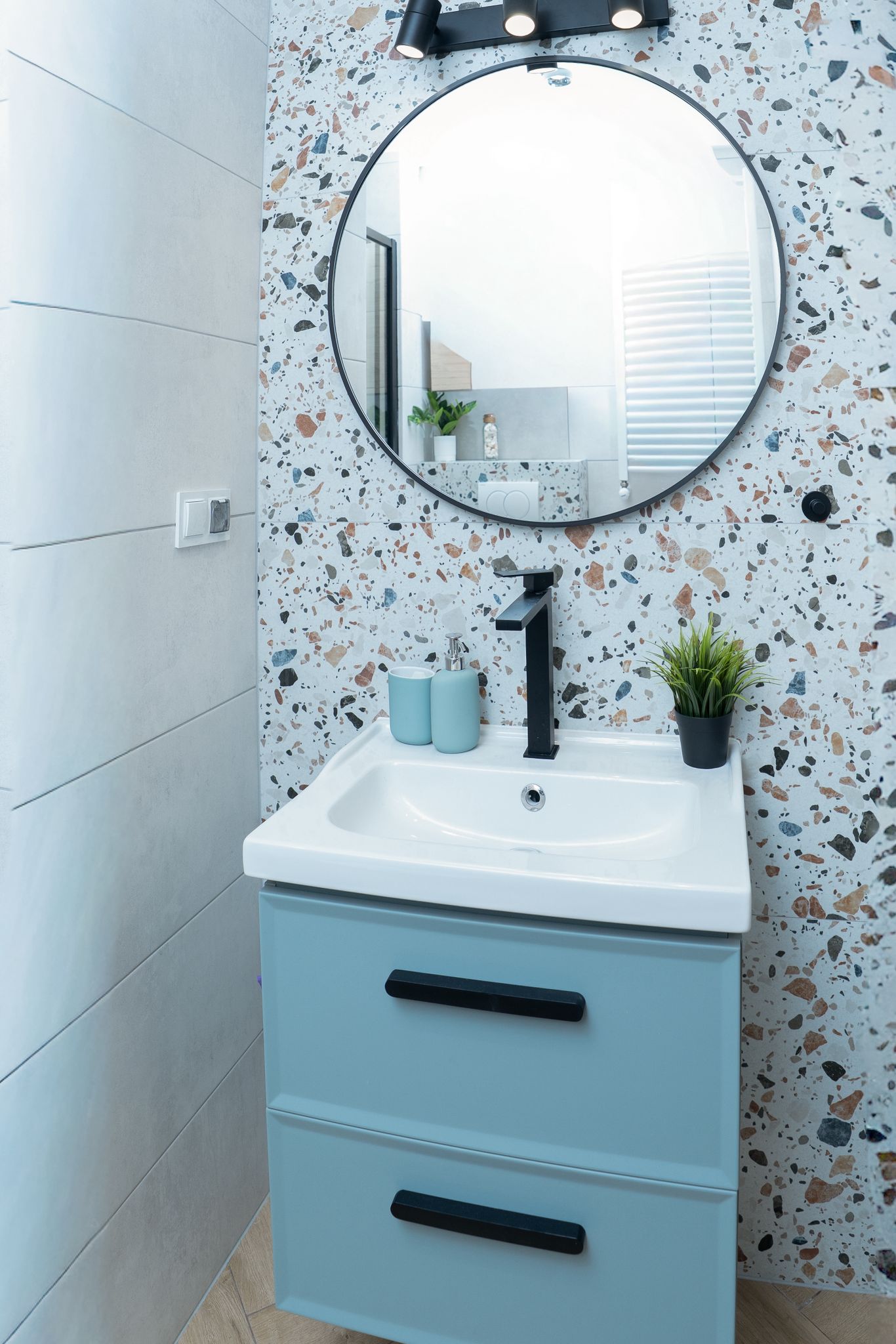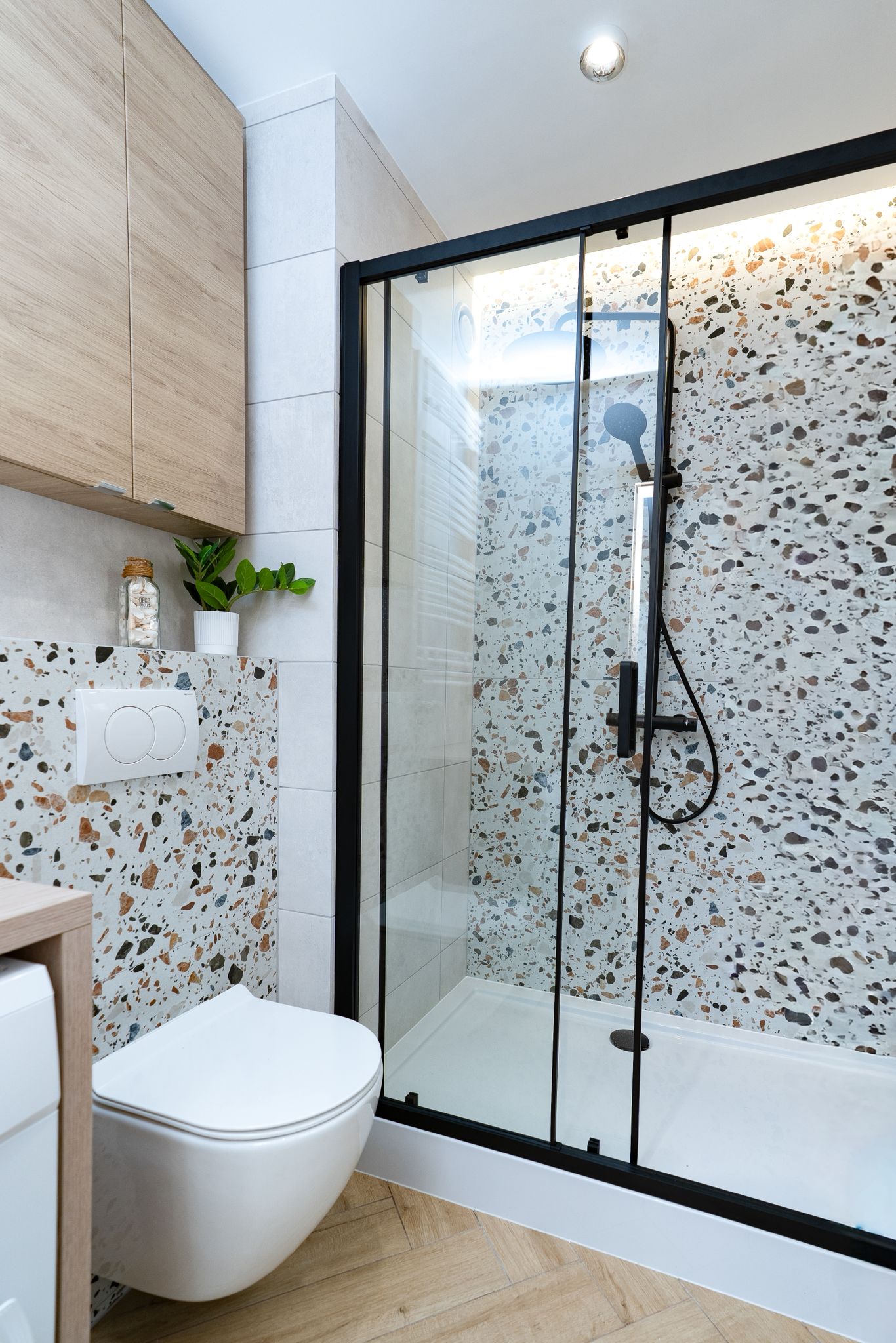 - Łazienka: Designerska łazienka z kabiną prysznicową typu walk-in (czarna armatura), wykończona modnym lastryko. Na wyposażeniu znajduje się pralka.