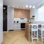 Nowoczesny design w stylu boho – wnętrze łączy elegancję z przytulnością dzięki detalom takim jak jodełka na podłodze, stylowe lamele i marmurowe akcenty, co tworzy wyjątkowy klimat.
