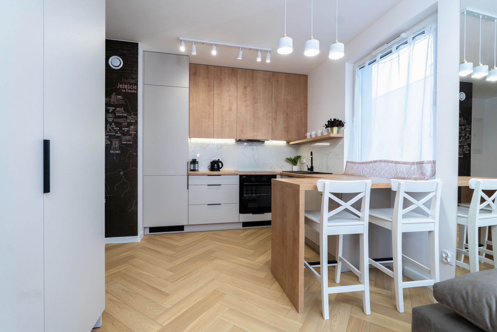 Mieszkanie zostało zaprojektowane z dbałością o każdy detal, łącząc przytulny styl boho z nowoczesną elegancją (m.in. modna jodełka na podłodze, lamele, marmurowe akcenty).