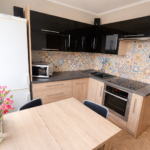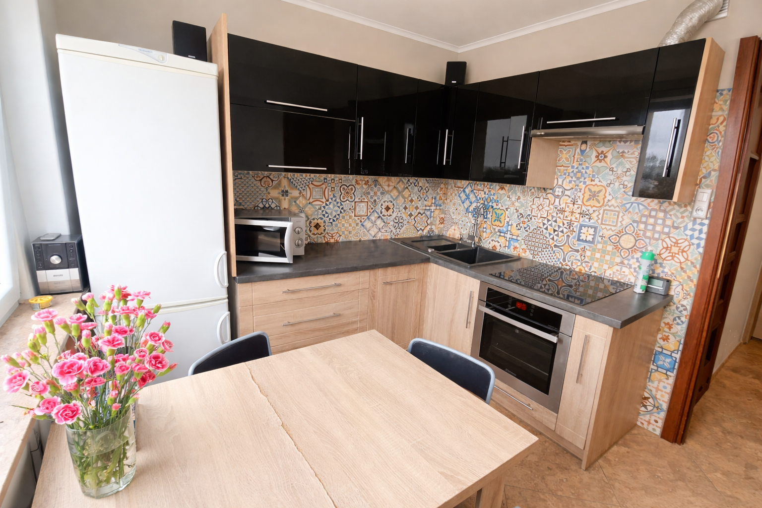 Funkcjonalna, nowoczesna kuchnia – duża przestrzeń z jadalnią oraz pełnym wyposażeniem (w tym mikrofalówką) ułatwia codzienne gotowanie.