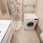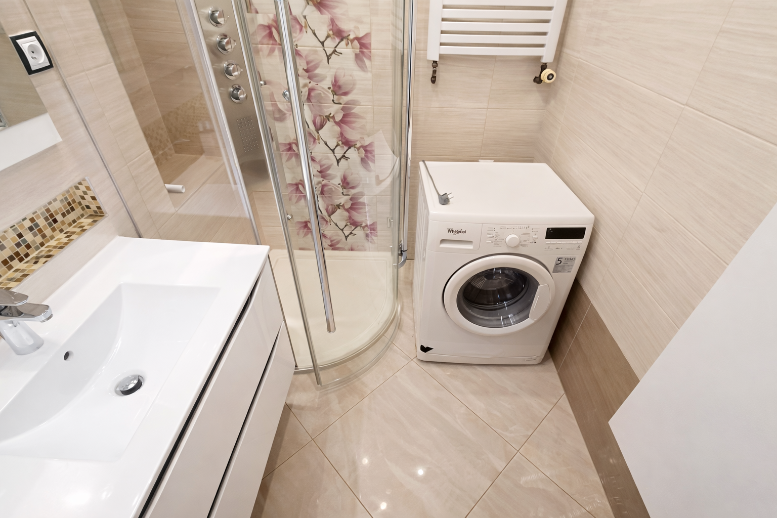 Łazienka: Funkcjonalna, z kabiną prysznicową oraz pralką.